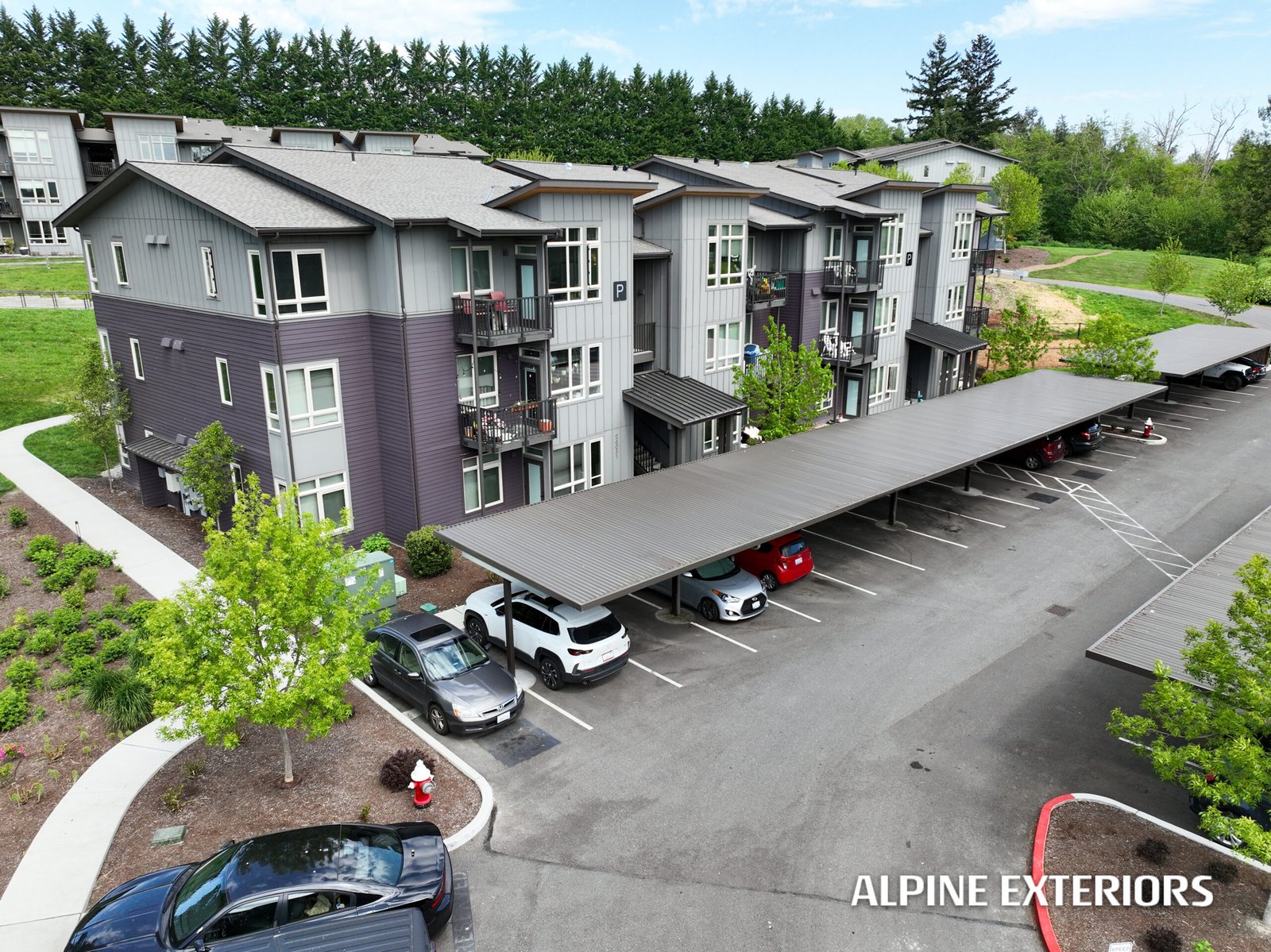 As a key architectural feature, Alpine Exteriors also furnished and installed pine tongue & groove enclosed soffits across all building elevations, stairwells, and breezeways — providing a natural wood accent that adds warmth and curb appeal to this large-scale multi-family property.