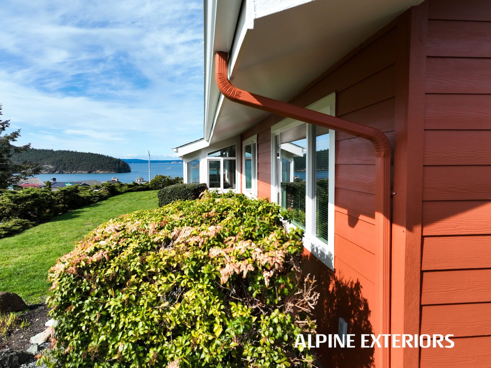 anacortes_james_hardie_lap_siding_fidalgo_bay_waterfront_remodel_milgard_tuscany_windows_resilience_sherwin_williams_paint_white_trim_belly_band_rustic_orange_siding_custom_exterior_finish_coastal_home_protection_weatherproof_siding_rot_resistant_siding_system_pacific_northwest_contractor_marine_climate_ready_home_exterior_best_siding_company_anacortes_wa_home_window_upgrade_paint_and_siding_combo_hardie_wrap_weather_barrier_exterior_envelope