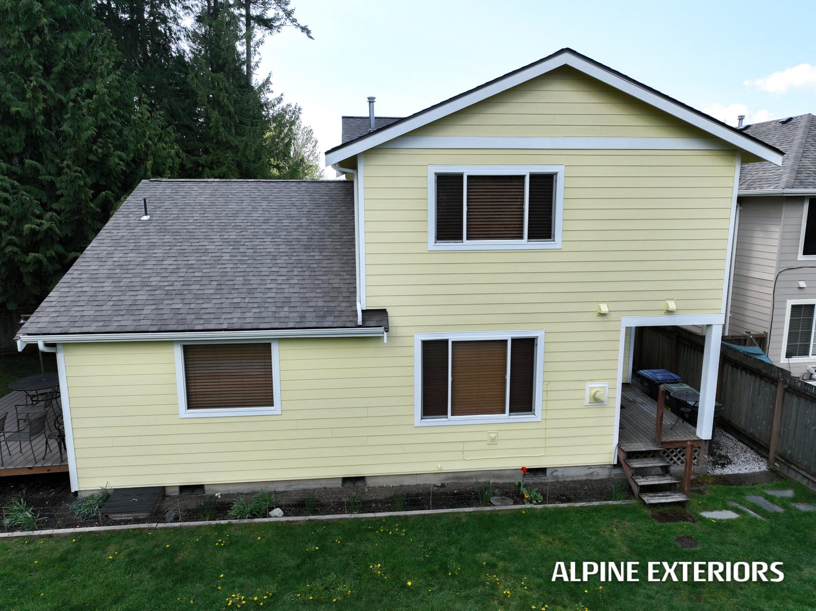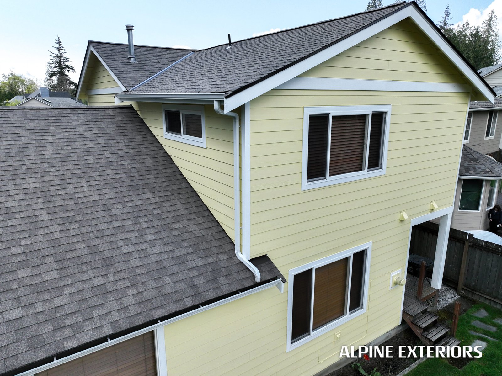 james_hardie_lap_siding_gaf_roof_replacement_sherwin_williams_resilience_paint_white_trim_belly_bands_full_exterior_remodel_weatherproof_home_shell_fiber_cement_siding_home_paint_upgrade_roofing_contractor_bellingham_whatcom_county_home_restoration_project_code_compliant_installation_hardie_wrap_weather_barrier_best_roof_and_siding_company_wa_energy_efficient_cladding_mildew_resistant_paint_pacific_northwest_remodel_alpine_exteriors_portfolio