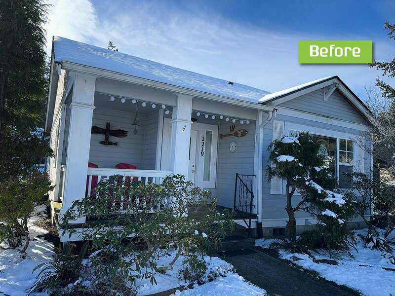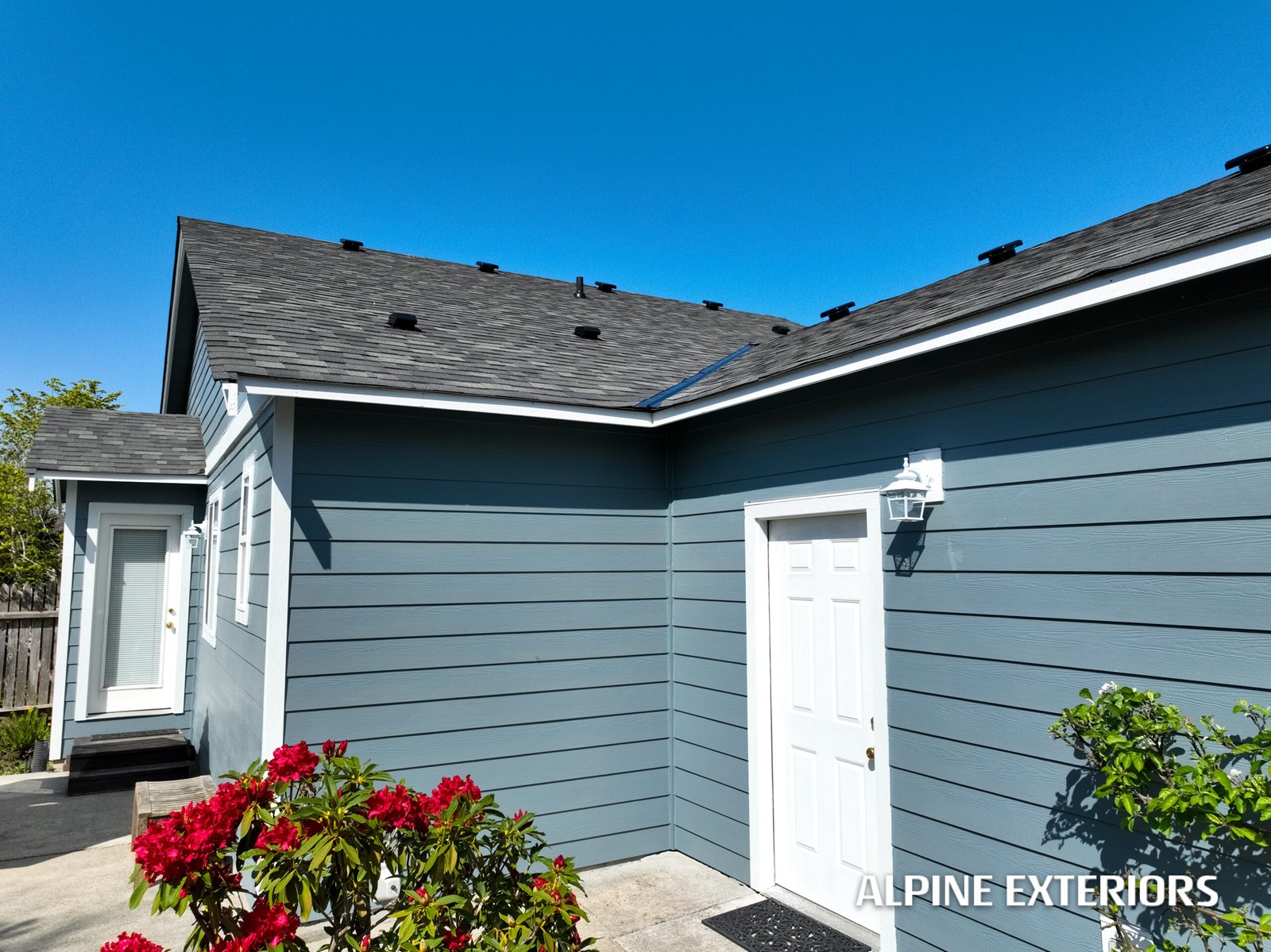 For Project 1728, Alpine Exteriors delivered a complete exterior transformation using James Hardie® ColorPlus® lap siding in Boothbay Blue, accented with Arctic White 5/4×4 trim, bold 5/4×8 belly bands, and cleanly finished Hardie® porch soffits — bringing coastal charm and high-performance protection to this Pacific Northwest home.