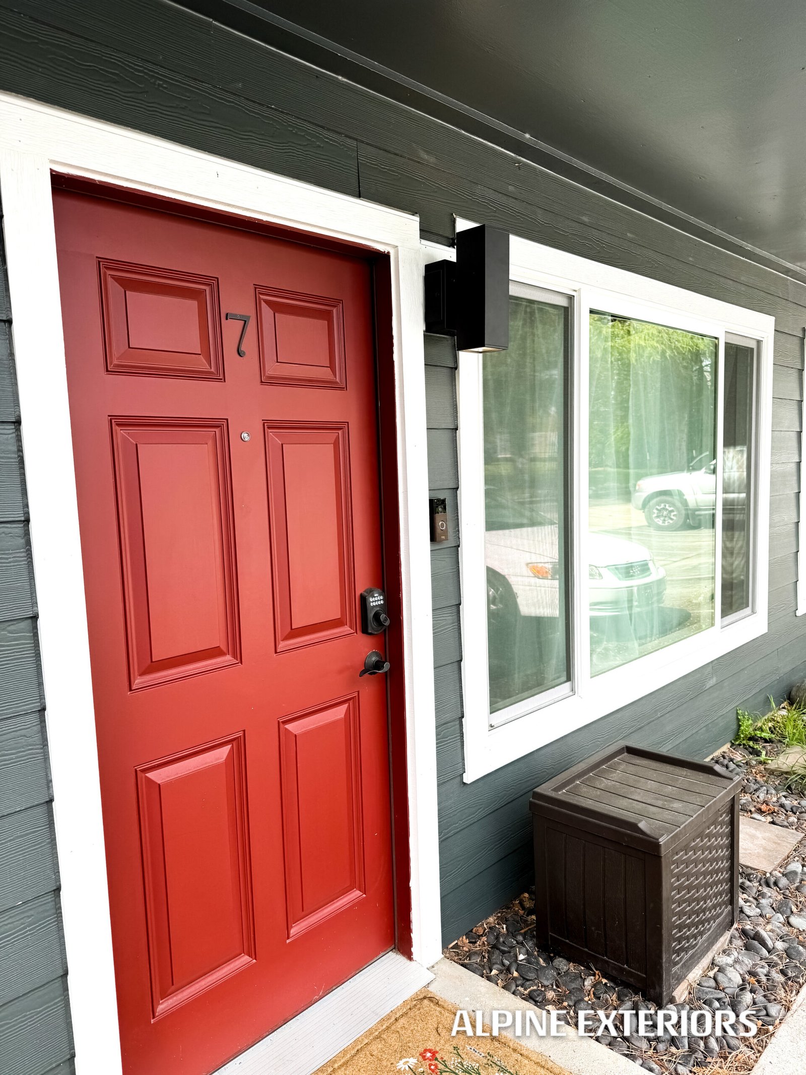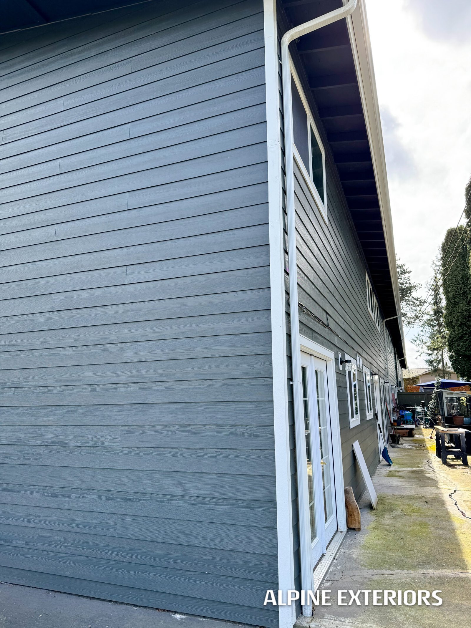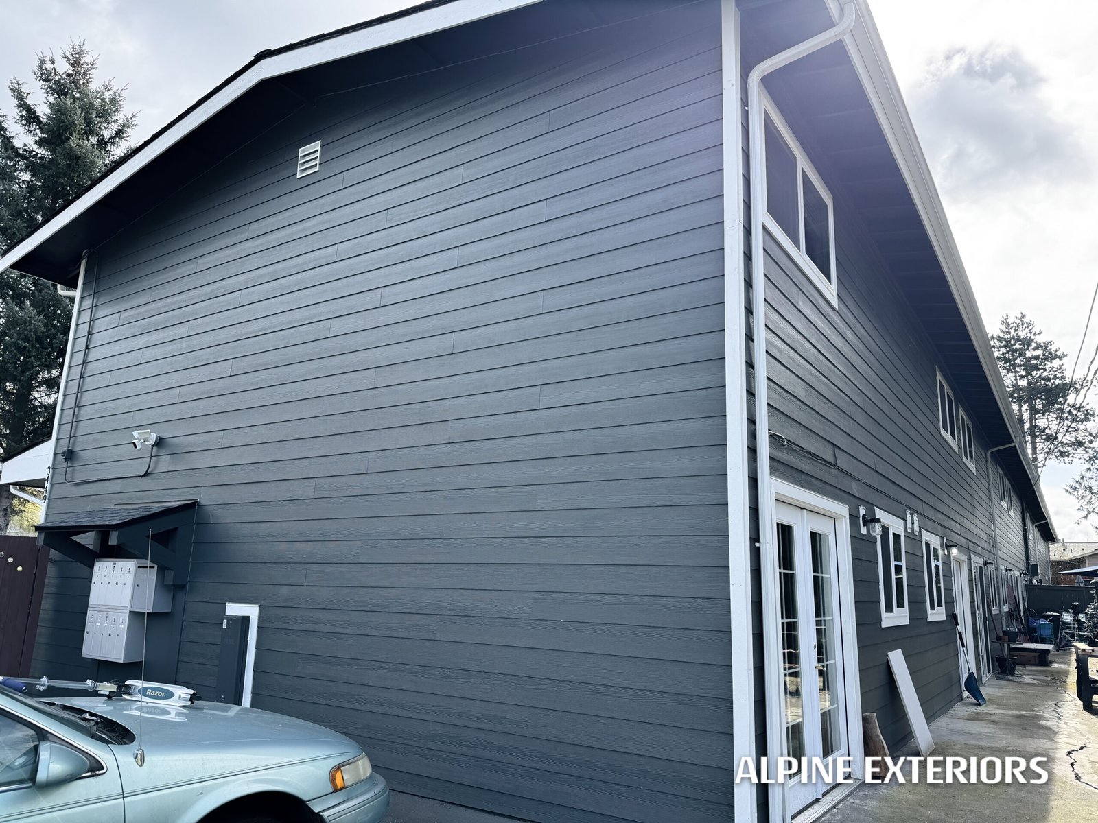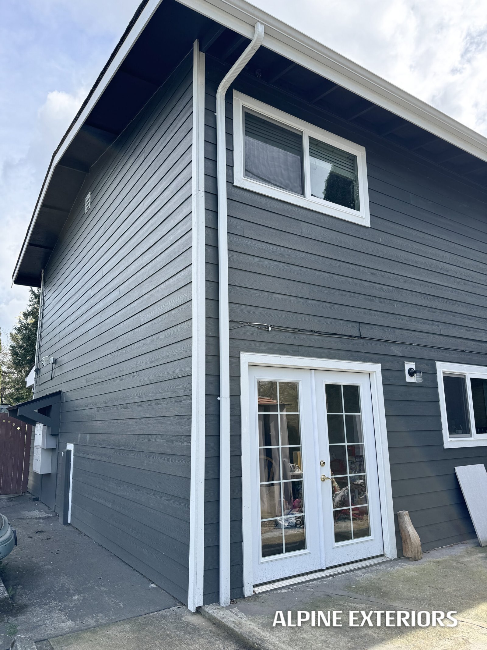 We replaced all failing T1-11 siding with James Hardie® ColorPlus® lap siding in Iron Gray, complemented by Arctic White factory-finished trim and belly bands. This system offers exceptional resistance to moisture, UV degradation, and pests — a long-term solution for Northwest weather.