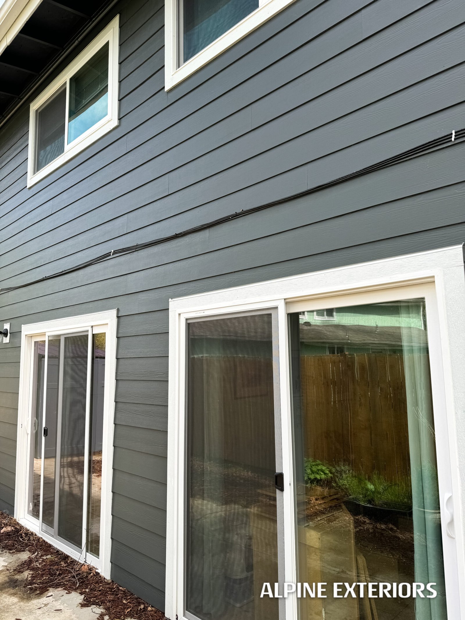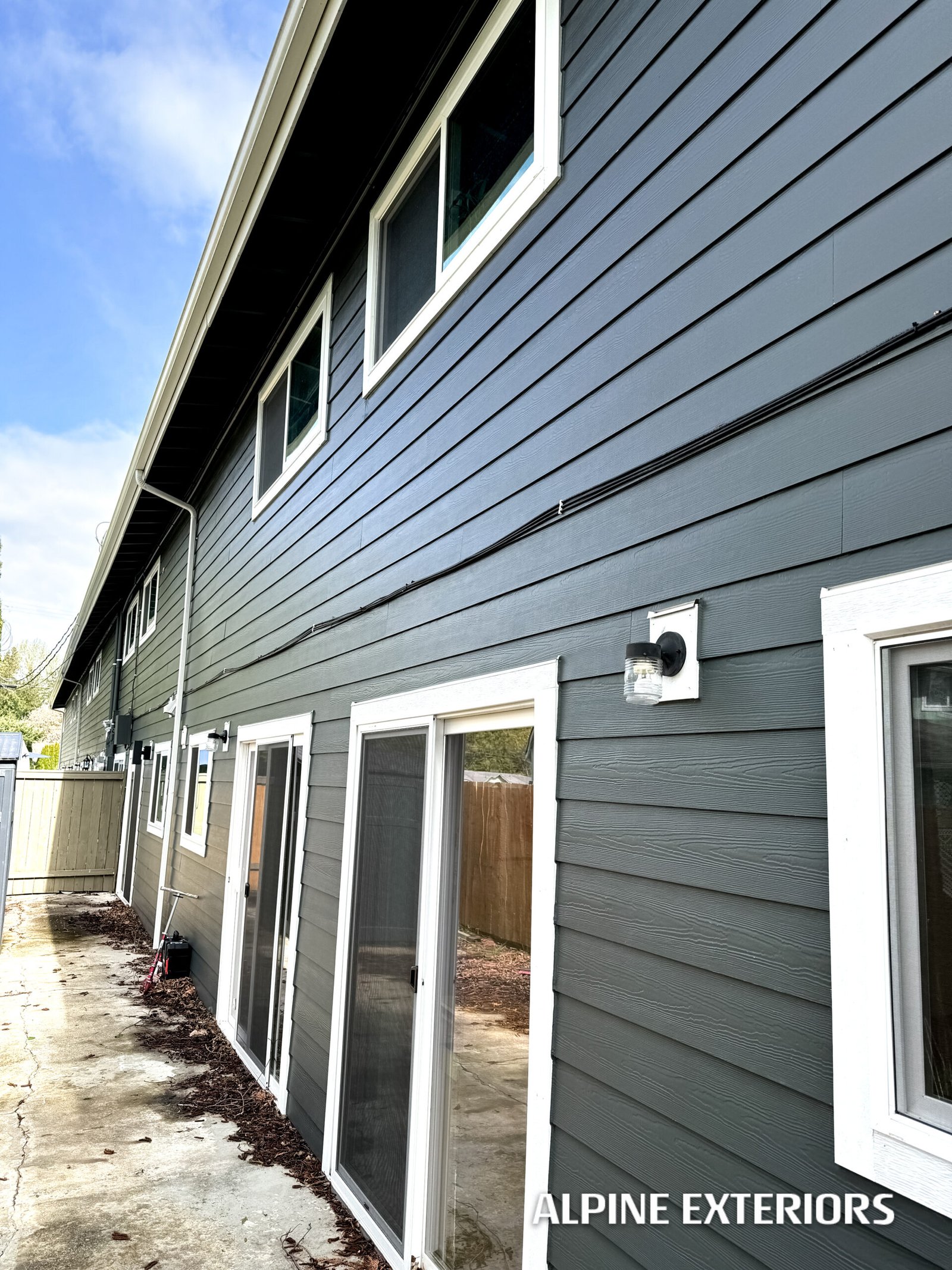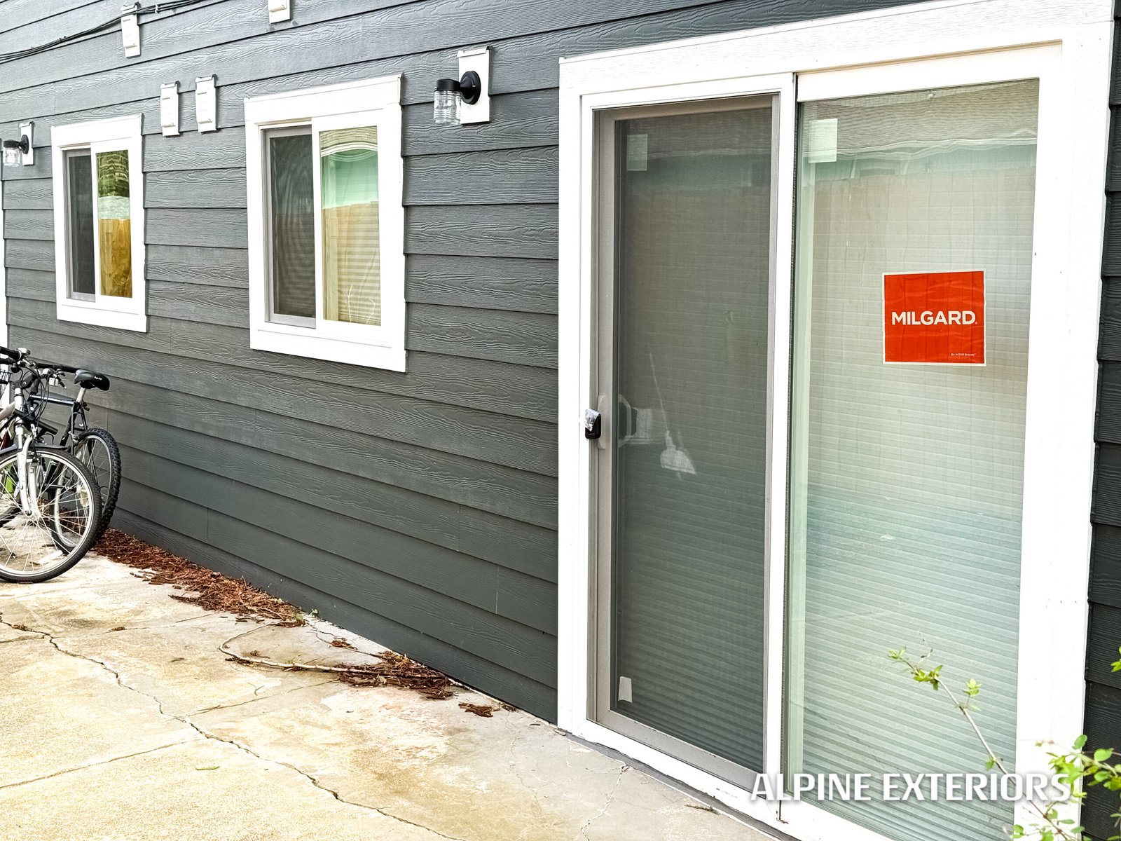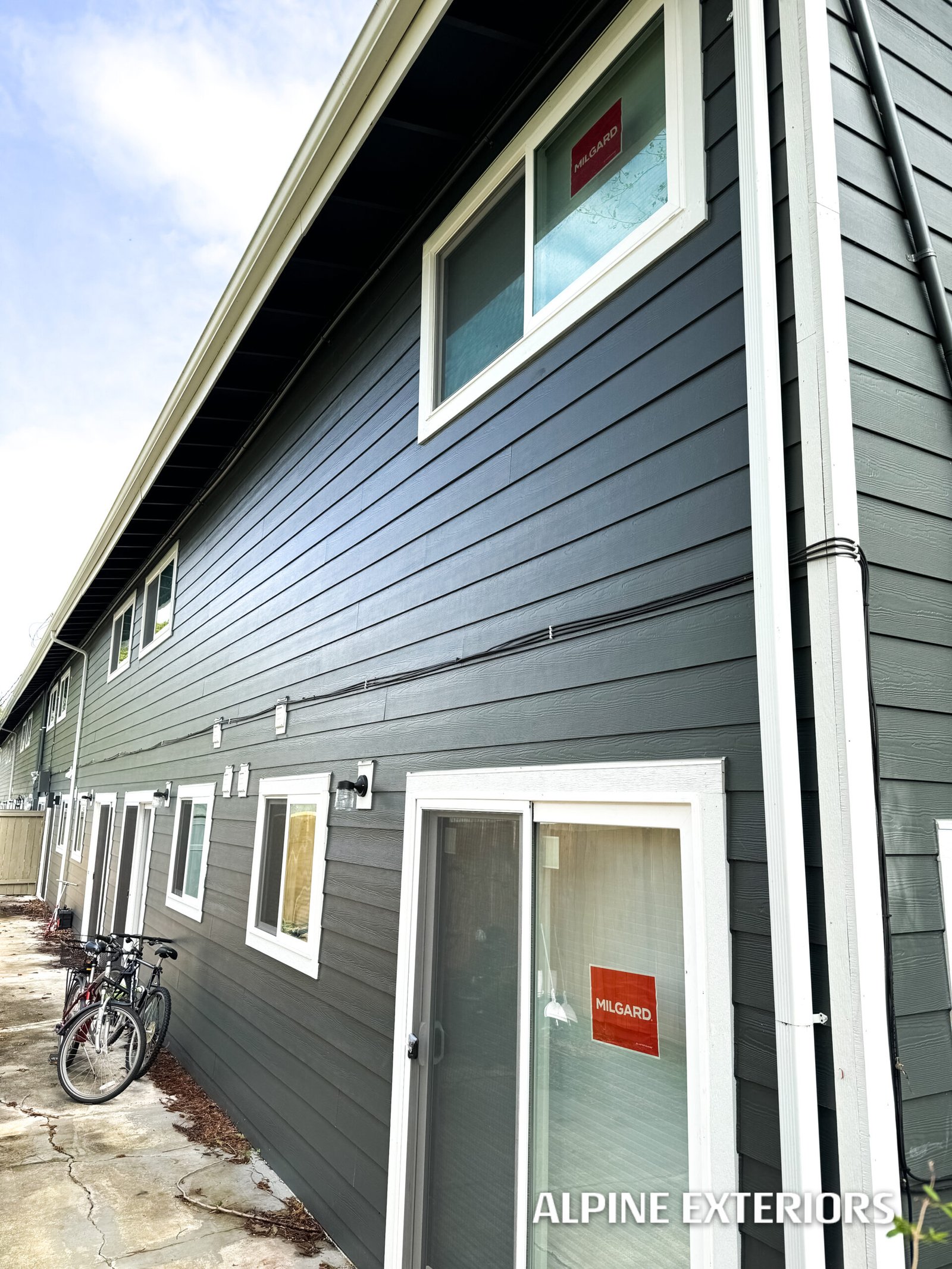 bellingham_condo_siding_replacement_hoa_exterior_renovation_james_hardie_colorplus_iron_gray_lap_siding_arctic_white_trim_belly_bands_sherwin_williams_painted_soffits_condo_window_door_replacement_milgard_tuscany_series_sliding_doors_condominium_rot_repair_sheathing_installation_batt_insulation_upgrade_t1_11_siding_removal_multifamily_cladding_solution_alpine_exteriors_redwood_condos_project_1729_condo_building_envelope_upgrade_whatcom_county_condo_contractor_energy_efficient_condo_exterior_remodel